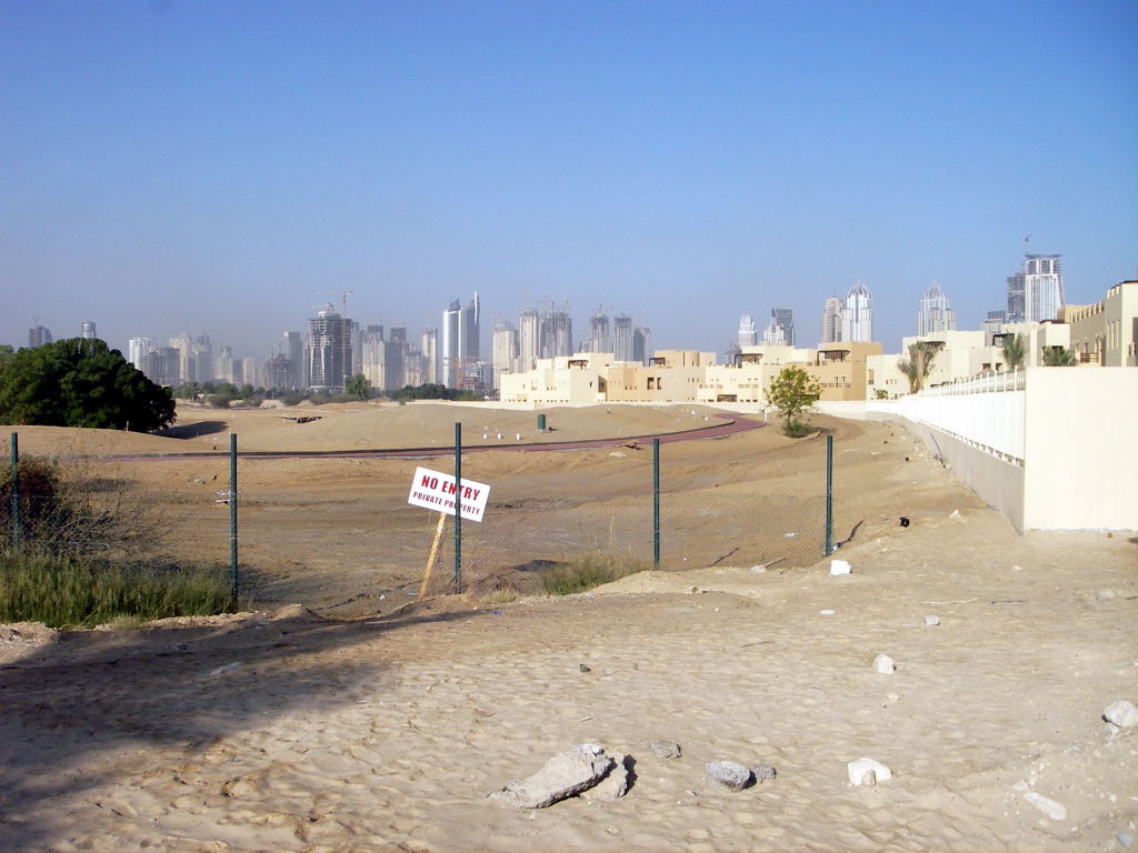 Massive construction projects can been seen in the distance and an unfinished golf course built into the sand. |