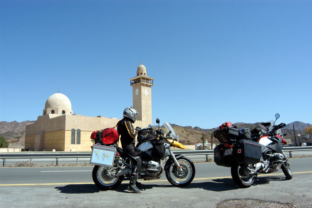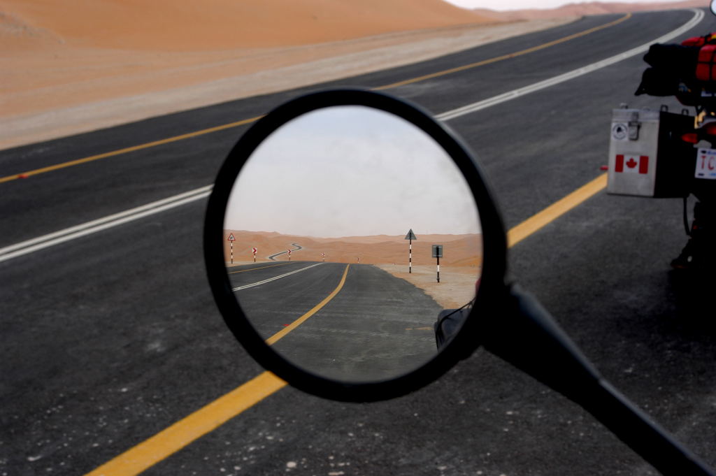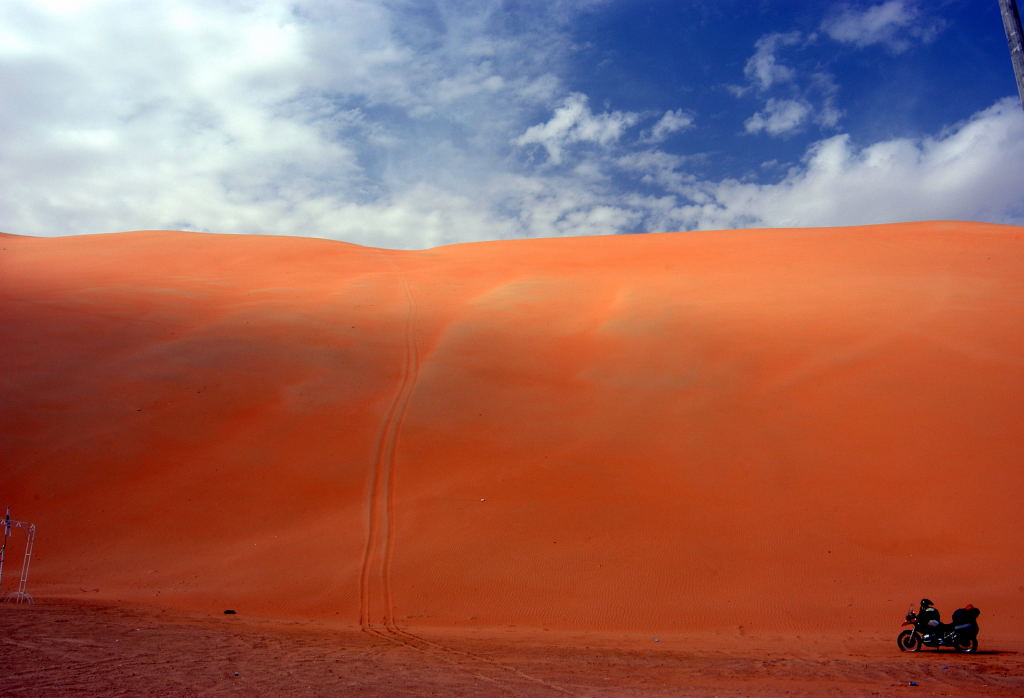 ...winding its way through the desert. The next day we woke up to a sand storm and as we rode through it for hours, visibility was very poor and it felt like standing infront of a sandblaster. |