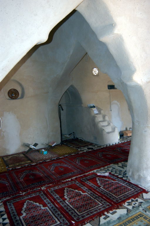The mosque is built of stone and mudbricks and coated in many layers of whitewashed plaster. |